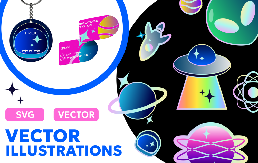 8X Vector Illustrations (sticker pack) - UFO, Planets, Rocket